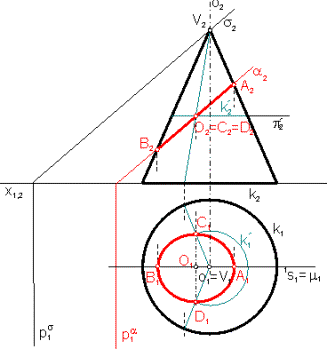 Vrcholy C1, D1 pôdorysu elipsy môžeme odvodiť tiež z druhého priemetu (O2=C2=D2) pomocou obrazov tvoriacich priamok kužeľovej plochy, ktoré