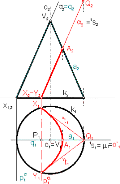 kužeľovej plochy rovinou a, ktorá je kolmá na priemetňu v Mongeovom premietaní.