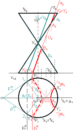 asymptôt, ktoré ležia v rovine a (1as=1PO, 2as=2PO). Ich prienikom je nárys O2 stredu