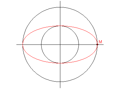 Veďme ľubovoľnú polpriamku q so začiatkom S v strede elipsy a označme M´ jej priesečník s kružnicou k´ a M´´ s kružnicou k´´. Spojnica bodov MM´ musí byť rovnobežná so smerom 2o prvej afinity, a súčasne MM´´ musí byť rovnobežná so smerom 1o druhej afinity. Zostrojený bod M elipsy je preto vrcholom pravouhlého trojuholníka s preponou M´M´´.